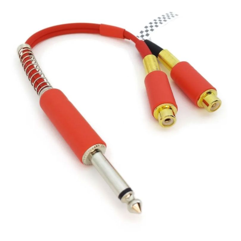 Adaptador com 1 Plug P10 (conector 6,5mm TS ou TRS macho) mono ou estereo + 2 Plugs jack RCA (conectores femeas).